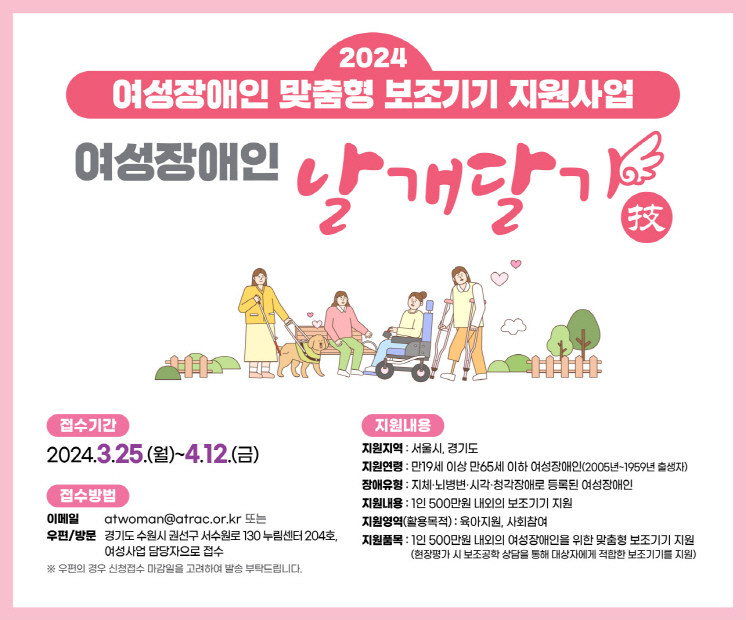 LG생활건강이 아름다운재단과 함께 육아·사회활동 등 일상 생활에 필요한 맞춤형 보조기기를 지원하는 ‘여성장애인 날개달기 사업’에 참여할 지원자를 이달 12일까지 모집한다.