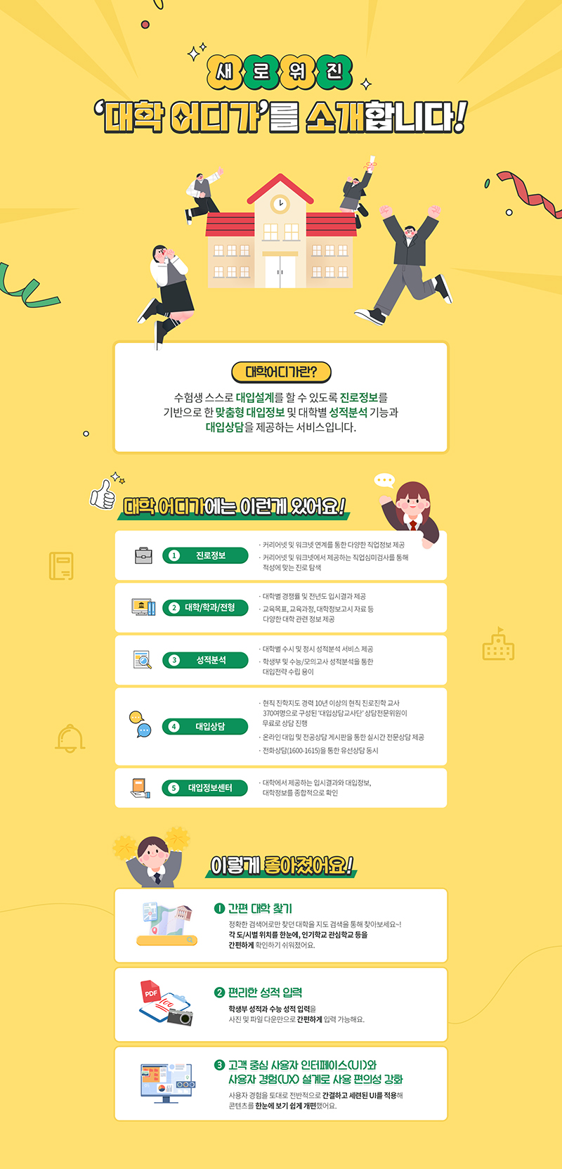 특히 교육부는 대학 입시를 준비하는 학생, 학부모, 교원 대학의 의견을 최대한 반영해 보다 활용도가 높은 대입정보포털로 정착할 수 있도록 노력하고 있는데, 이런 일환으로 지난 2월 29일 ‘어디가’ 누리집을 전면 개편한 바 있다.