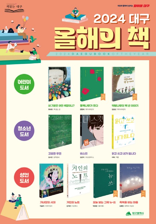 아울러, 2024 대구 올해의 책은 관내 공공도서관, 작은도서관, 시내 대형서점 등에서 만날 수 있으며, 교보문고(대구점, 칠곡센터), 영풍문고(롯데백화점 대구점)에서는 10% 현장할인 혜택을 받을 수 있다.