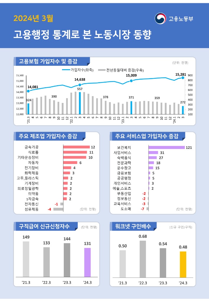 (가입자수) 2024년 3월말 기준 고용보험 상시가입자는 1,528만 1천명으로 전년동월대비 27만 2천명(+1.8%) 증가 제조업(+54천명)과 서비스업(+217천명)은 증가, 건설업(-6천명)은 감소