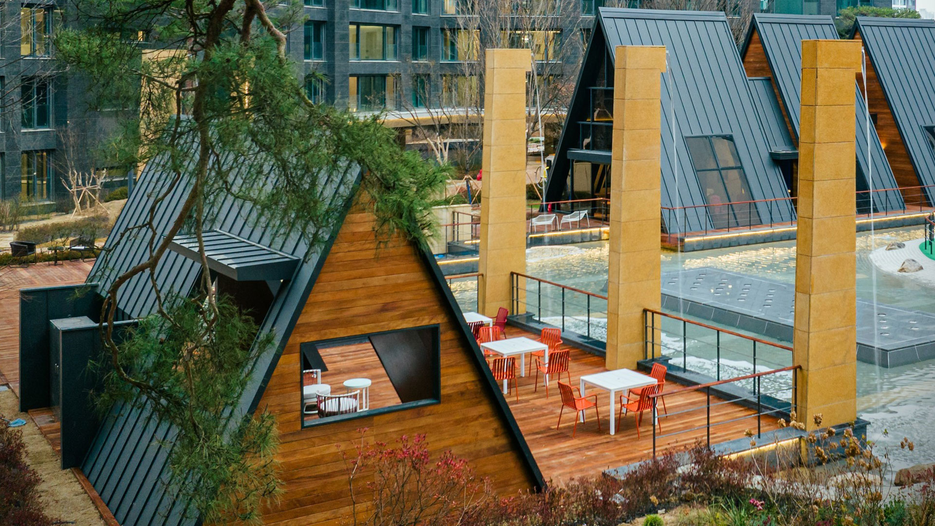 티하우스는 현대건설 자체 디자인으로 탄생했다. 자연을 모티브로 한 티하우스 디자인은 동화 속 오두막을 연상케 한다. 도심 속 자연 분위기를 연출하기 위해 우드 소재의 삼각 오두막 디자인을 채택했다. 티하우스 주변에는 수경시설과 식재가 조화를 이루고 있어 주변 경관을 즐기며 쉬어갈 수 있다.