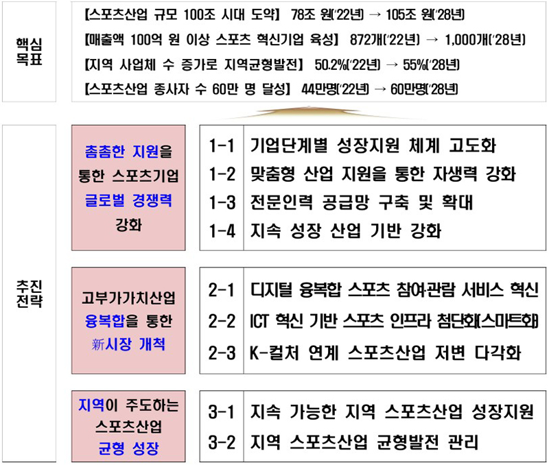 매출액 100억 원 이상 스포츠 혁신기업은 2022년 872개에서 2028년 1000개로, 스포츠산업 종사자 수도 44만 명에서 60만 명으로 넓힐 계획이다.