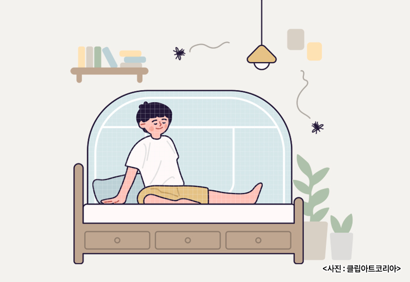 모기가 실내로 침입하지 못하도록 방충망을 점검하고 필요시 모기장을 사용한다.