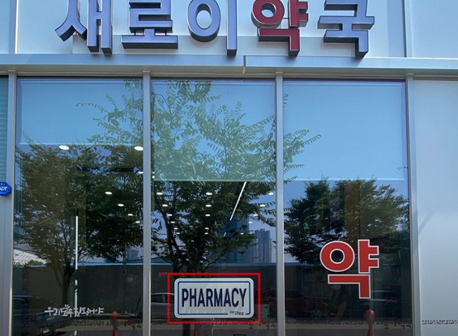 영어 표지판은 눈에 잘 띄도록 흰색 바탕에 파란색으로 ‘PHARMACY’ 단어를 써 넣어 시인성(視認性)과 상징성(象徵性)을 극대화했다.