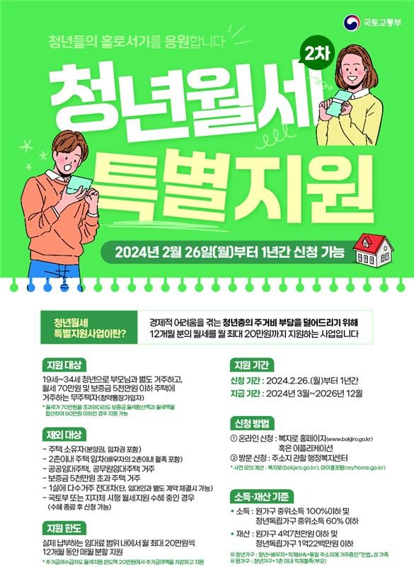 이기봉 국토부 주거복지정책관은 “청년월세 특별지원 사업이 독립하는 청년의 걱정을 하나라도 덜었으면 한다”며 “거주 요건 폐지와 더불어 지원 기간도 연장하니 많은 신청을 바란다”고 말했다.