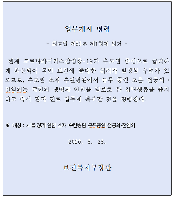 박능후 보건복지부 장관은 26일 정부서울청사에서 브리핑을 갖고 “정부는 오늘 오전 8시를 기해 수도권에 소재한 수련병원에 근무 중인 전공의와 전임의를 대상으로 업무개시명령을 발동한다”고 밝혔다.