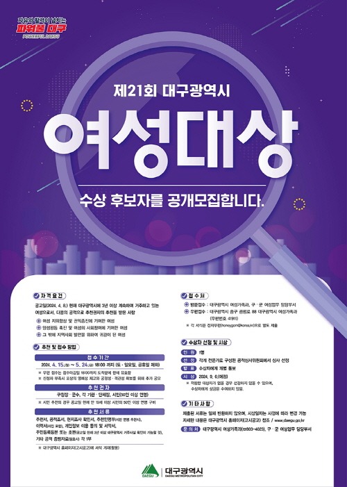 대구광역시는 여성의 지위 향상과 양성평등사회 구현을 위해 공헌한 여성을 발굴하기 위해 4월 15일(월)부터 5월 24일(금)까지 ‘제21회 대구광역시 여성대상’ 수상 후보자를 공개 모집한다.