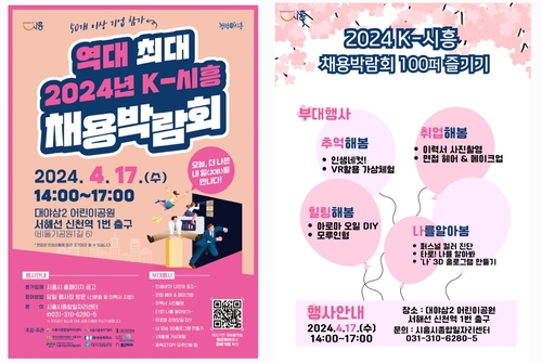 시흥시가 주최하는 '역대 최대 2024년 K-시흥 채용박람회'가 오는 17일 오후 2시부터 5시까지 서해선 신천역 앞에 있는 대야삼2 어린이공원(비둘기공원1길 6)에서 열린다.