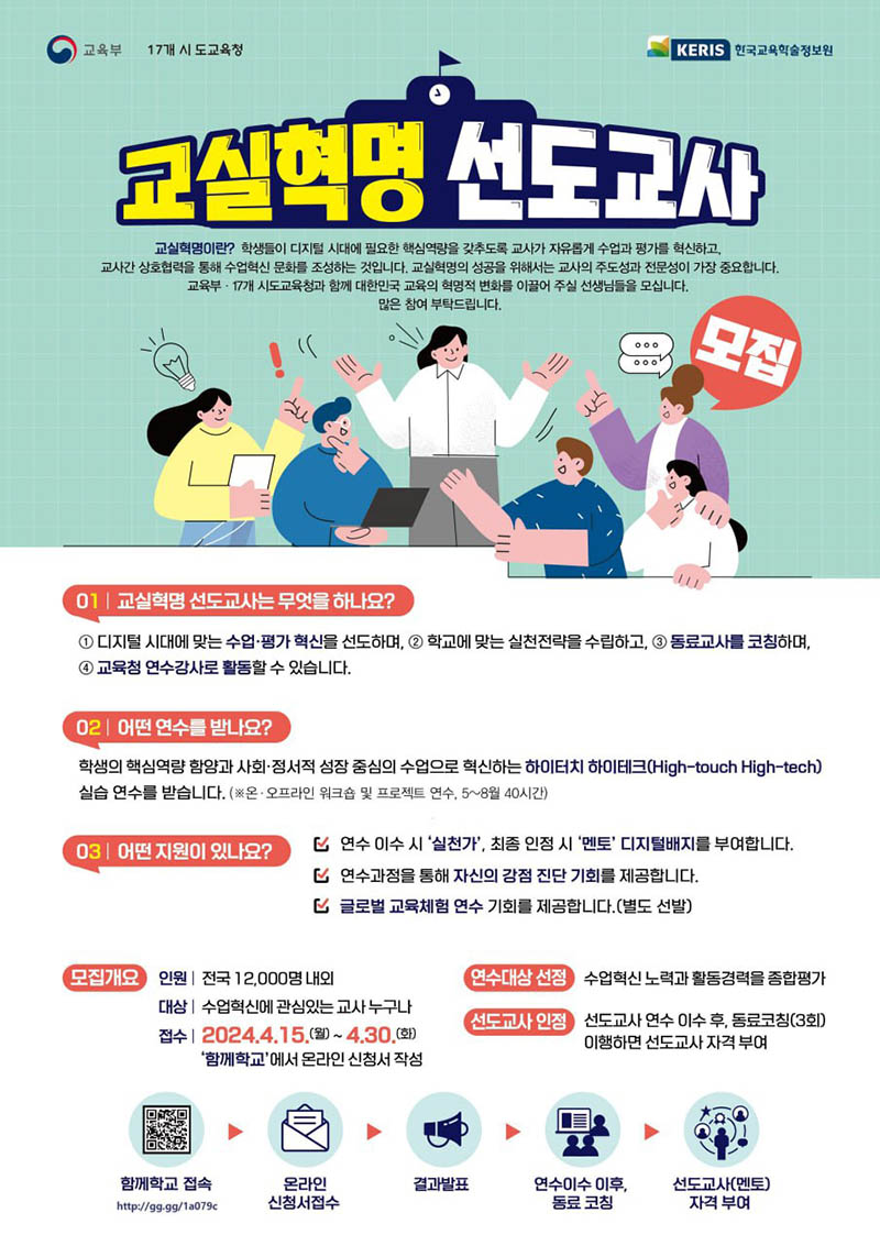 교육부는 올해 1만 1500명을 공모 등으로 선발할 예정으로, 희망자는 이달부터 ‘함께학교’ 누리집( https://togetherschool.go.kr )을 통해 신청할 수 있다. 한 달간 공모를 진행한 후 교육부와 시도교육청이 공동 심사해 다음 달 중 선도교사 연수 대상자를 선정한다.