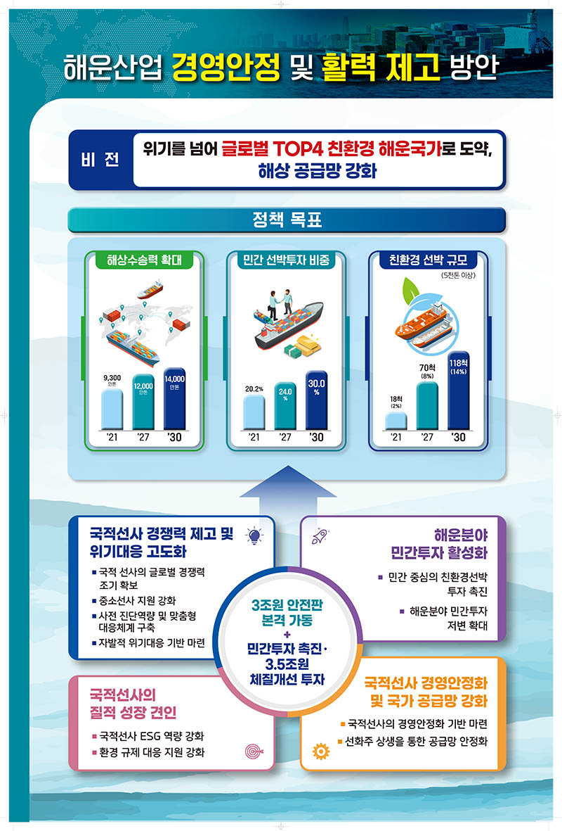 정부는 선사별 맞춤형 위기대응 체계를 구축해 국적선사의 경영 악화를 사전에 방지하고, 친환경 규제와 환경·사회·투명경영(ESG) 경영 확산에 선제적으로 대응할 수 있도록 민간 자본의 친환경 선박 투자를 활성화해 수출입 물류 등 우리나라의 해상 공급망을 강화하고자 이번 방안을 마련했다.