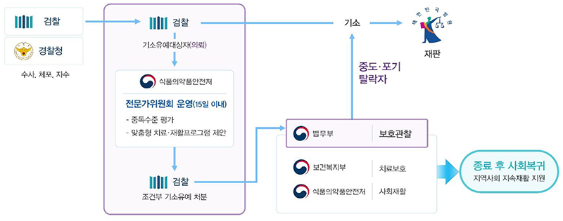 이 밖에 치료가 필요한 중독자는 치료보호제도와 적극 연계한다. 전문가위원회를 통해 치료 연계 판단 때 검사의 의뢰를 통해 치료보호심사위원회를 거쳐 치료를 제공해 원스톱 치료 지원도 추진한다.