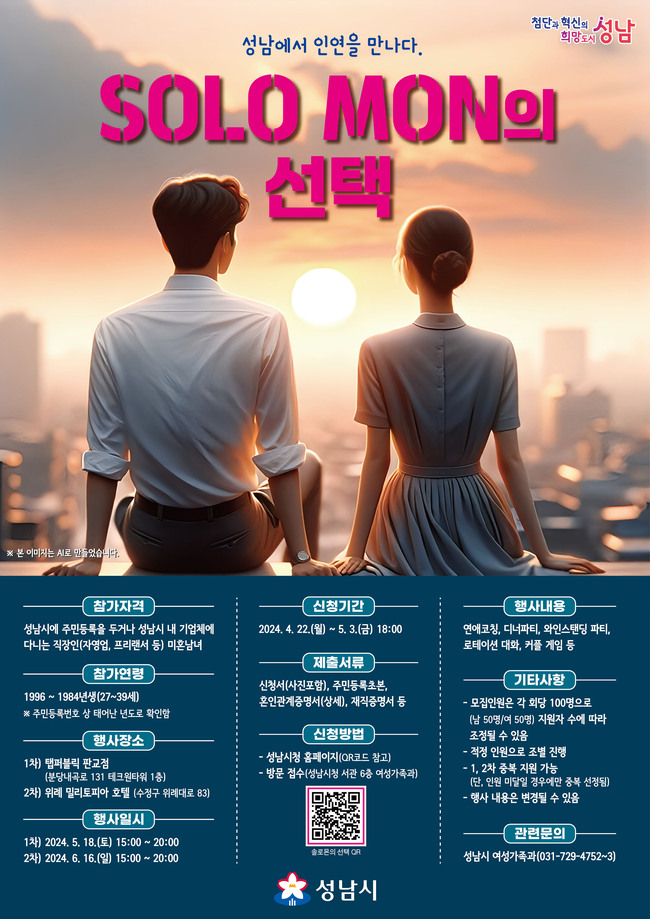 성남시는 미혼 청춘남녀 결혼 장려 시책의 하나로 지난해에 이어 올해에도 5 차례의 ‘ 솔로몬의 선택 ’ 행사를 연다고 16 일 밝혔다 .