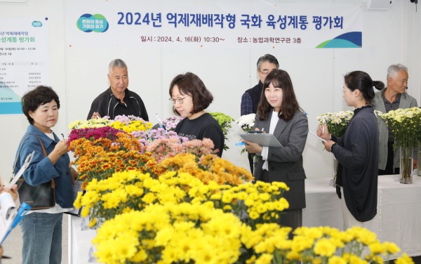 이날 평가회에서는 겨울철 낮은 온도에서도 생육과 개화반응이 안정적인 국화 85여 종에 대한 재배 특성 소개와 기호도 평가를 통해 우수 계통을 선발했다.