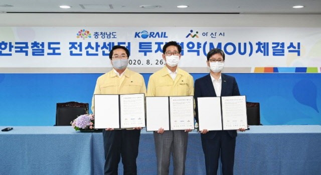 한국철도가 26일 오전 충청남도청에서 충청남도, 아산시와 함께 ‘한국철도 전산센터(이하 철도전산센터) 투자협약’을 체결했다고 밝혔다. 세 기관은 한국판 뉴딜 중점과제로 선정된 첨단 전산센터 건립에 힘을 모으기로 했다.