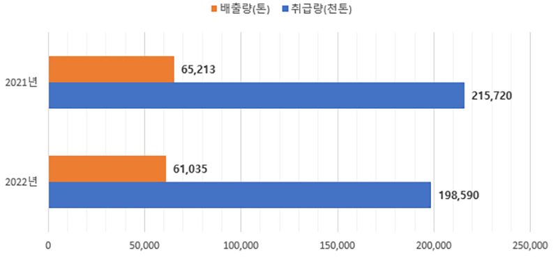 환경부는 2022년도 화학물질 배출량을 조사한 결과, 3832개 업체에서 234종의 화학물질 6만 1035톤이 대기(6만 808톤) 및 수계(227톤)로 배출되었다고 16일 밝혔다.