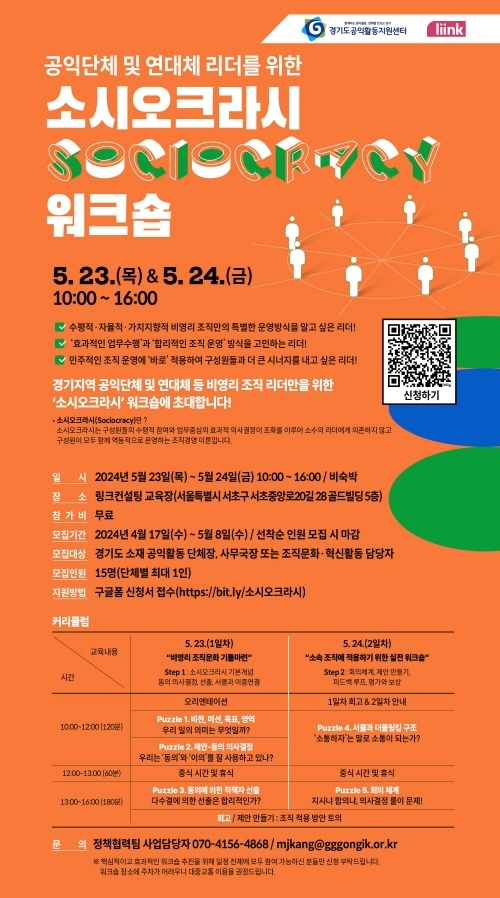 경기도공익활동지원센터(이하 센터)는 경기지역의 비영리 조직 리더를 위한 합의 프로세스 ‘소시오크라시 워크숍’ 참여자를 17일부터 모집한다.