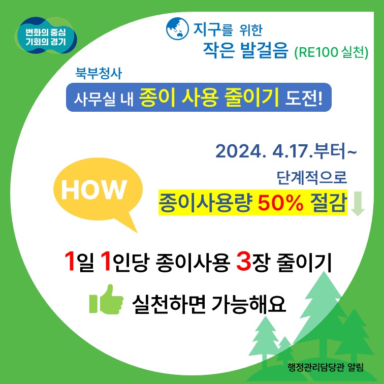 경기도 북부청사 ‘1인당 하루 종이 3장 줄이기’로 지구를 위한 작은 발걸음 RE100실천