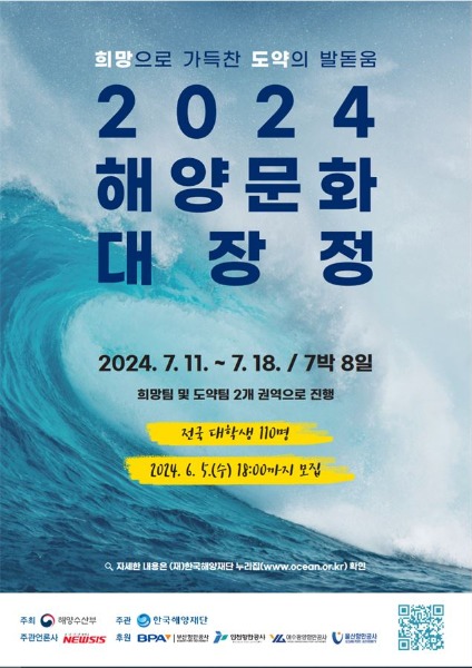 해양수산부(장관 강도형)와 한국해양재단(이사장 문해남)은 4월 17일(수)부터 6월 5일(수)까지 ‘2024년 해양문화 대장정(이하 대장정)’ 참가자를 모집한다.
