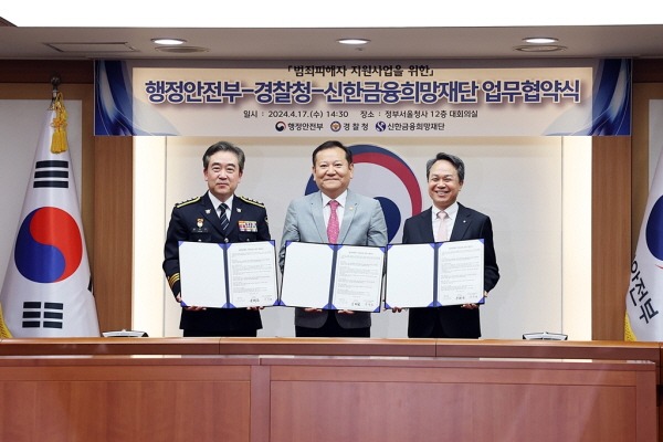 행정안전부와 경찰청은 17일 정부서울청사에서 행안부-경찰청-신한금융희망재단 간 범죄피해자 지원을 위한 업무협약을 체결했다고 밝혔다.