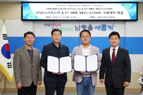 남동구는 최근 남동산단의 대표 식품기업인 ㈜온누리푸드텍(대표 이보영)과 인도네시아 기업(PT Mire Indo Utama) 간 구매계약 체결식을 가졌다고 16일 밝혔다.