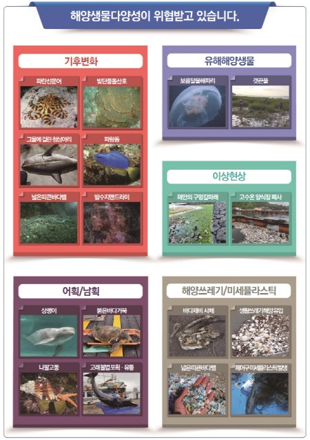 해양생물다양성은 해양생태계 내 생물종 및 생물체의 다양성뿐만 아니라 생물의 서식지와 생태계의 다양성을 포함하는 것으로, 식량공급이나 기후조절, 생태관광 등 다양한 해양생태계 서비스를 공급하며 우리 삶에 영향을 미치고 있다.