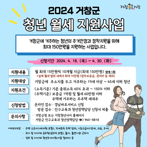 거창군은 청년의 주거비 부담 완화와 정주여건 개선을 통한 지역 정착을 돕기 위해 시행하는 '2024년 청년 월세 지원사업' 대상자를 4월 18일부터 30일까지 13일간 모집한다.