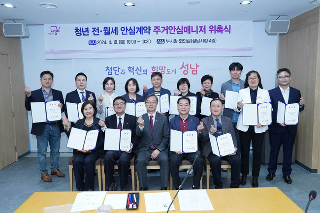 성남시는 부동산 전월세 계약에 어려움을 겪는 1 인 가구 청년들을 돕기 위해 공인중개사 16 명을 주거안심매니저로 위촉했다고 19 일 밝혔다 .