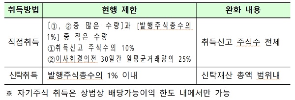 직접취득의 경우 취득신고 주식 수의 10%, 이사회 결의 전 30일간 일평균 거래량의 25% 등 제한이 있고 신탁취득은 발행주식 총수의 1% 이내로 제한하는 것이 규정이다.