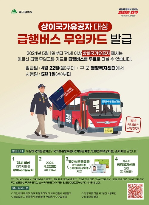 대구광역시는 전국 최초로 상이국가유공자를 대상으로 급행버스를 무료로 탑승할 수 있는 ‘어르신 급행무임 교통카드’를 4월 22일(월)부터 주소지 읍·면·동 행정복지센터에서 발급하며, 5월 1일(수)부터 무료로 탑승할 수 있다.