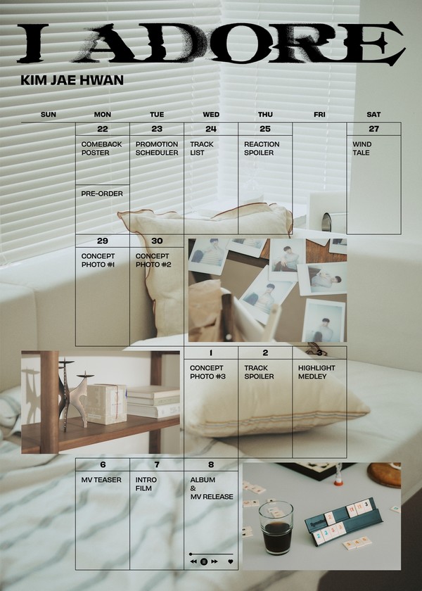 김재환은 23일 공식 SNS를 통해 일곱 번째 미니앨범 'I Adore (아이 어도어)'의 스케줄러 이미지를 공개했다.