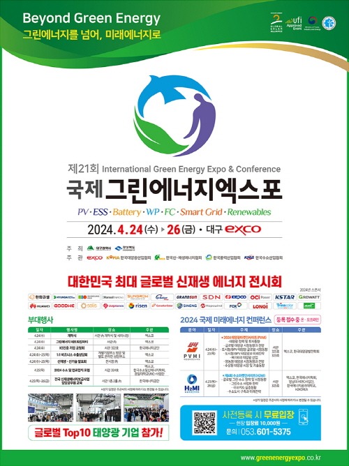 대구광역시와 경상북도가 주최하고 한국신재생에너지협회, 한국태양광산업협회, 엑스코 등이 주관하는 국제그린에너지엑스포가 오는 4월 24일(수)부터 26일(금)까지 사흘간 엑스코에서 25개국 330개사(1,100부스)가 참가한 가운데 개최된다.