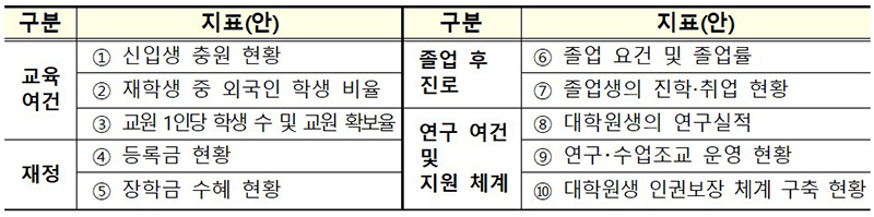 아울러 기존 대학원 정보공시 지표와 정책연구를 통해 발굴한 신규 지표 중 현장 관계자들이 생각하는 중요도와 정책적 필요성을 종합적으로 고려해 핵심적으로 관리가 필요한 지표(안)를 선별했다.
