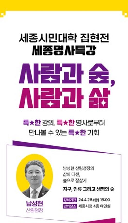 세종특별자치시가 오는 26일 오후 4시 시청 4층 여민실에서 남성현 산림청장 초청 특별강연을 진행한다.