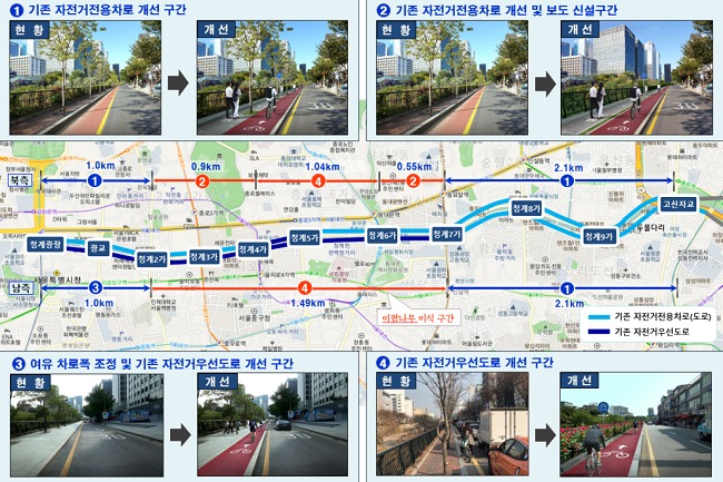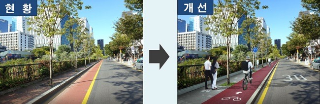 이를 위해 각 구간별 도로여건과 상황을 고려해 맞춤형 전략을 세웠다. 예컨대, 차도 바로 옆에서 불안한 더부살이 중인 기존 ‘자전거 전용차로’(북측 청계5가~고산자교 등)는 보도와 같은 높이로 올려 차도와 분리한다.