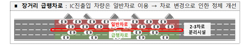 또 IC 진출입 차량의 차로 변경으로 인한 교통정체를 완화하기 위해 일반차로와 급행차로를 구분해 운영하는 ‘장거리 급행차로’ 도입을 검토해 사전 시뮬레이션을 거쳐 교통정체 개선효과를 분석한 뒤 시범도입한다.