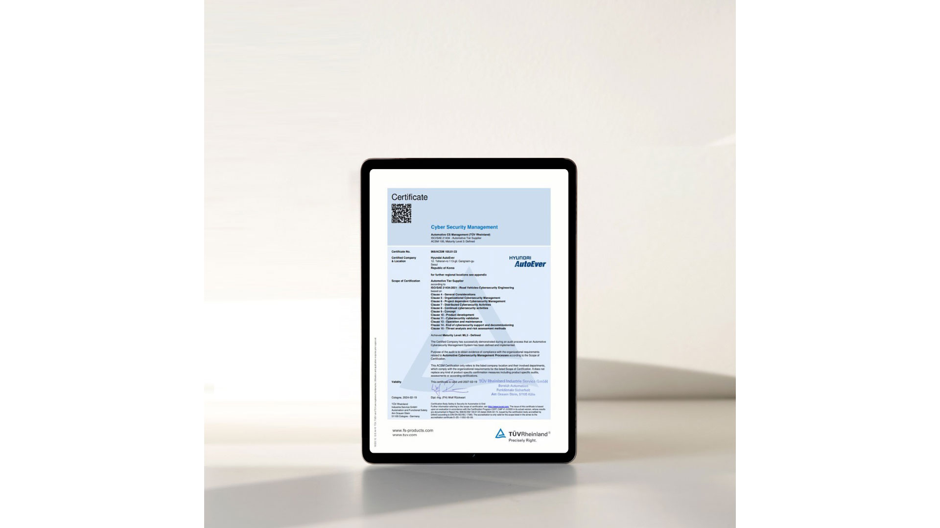현대오토에버가 글로벌 시험 및 인증 기관인 'TUV 라인란드(TUV Rheinland)'로부터 자동차 사이버보안 엔지니어링의 국제표준인 ISO/SAE 21434에 기반한 사이버보안 관리체계(CSMS) 레벨3 인증을 획득했다고 밝혔다.