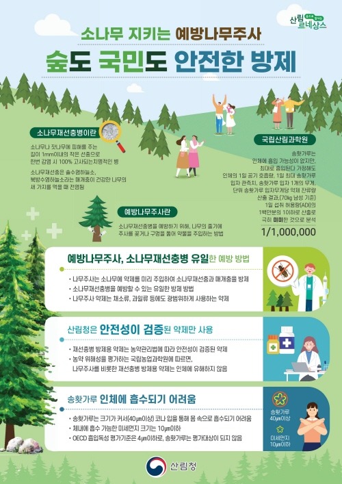 남성현 산림청장은 “소나무재선충병으로부터 소나무를 지켜낼 수 있도록 다양한 연구를 이어오고 있다” 라며 “국민들이 더욱 안심할 수 있는 과학적이고 친환경적인 방제기술을 개발해 나가겠다”고 말했다.
