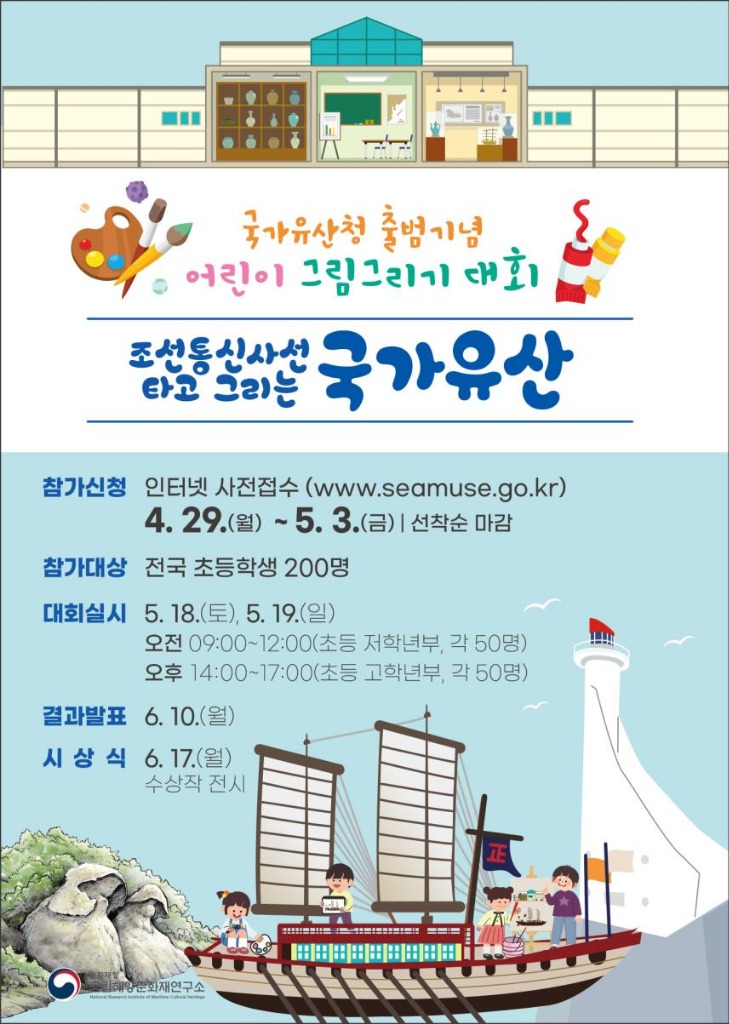 해양문화유산 그리기 대회는 목포에 있는 국립해양문화재연구소(소장 김성배)가 전국 초등학생을 대상으로 5월 18일(토)과 19일(일) 이틀간 어린이들이 ‘조선통신사선’에 직접 타고 목포 바다를 항해하면서 ‘국가유산’을 그리는 체험형으로 개최한다.