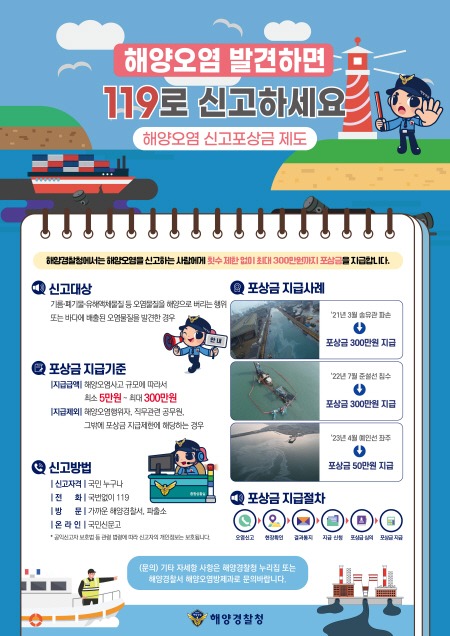 한편 해양오염 신고방법과 포상금 지급절차를 담은 포스터를 파출소, 연안여객터미널에 배포하며, 해양경찰청 누리집(www.kcg.go.kr)을 통해서도 적극적으로 홍보를 진행해 국민의 참여를 유도할 예정이다.