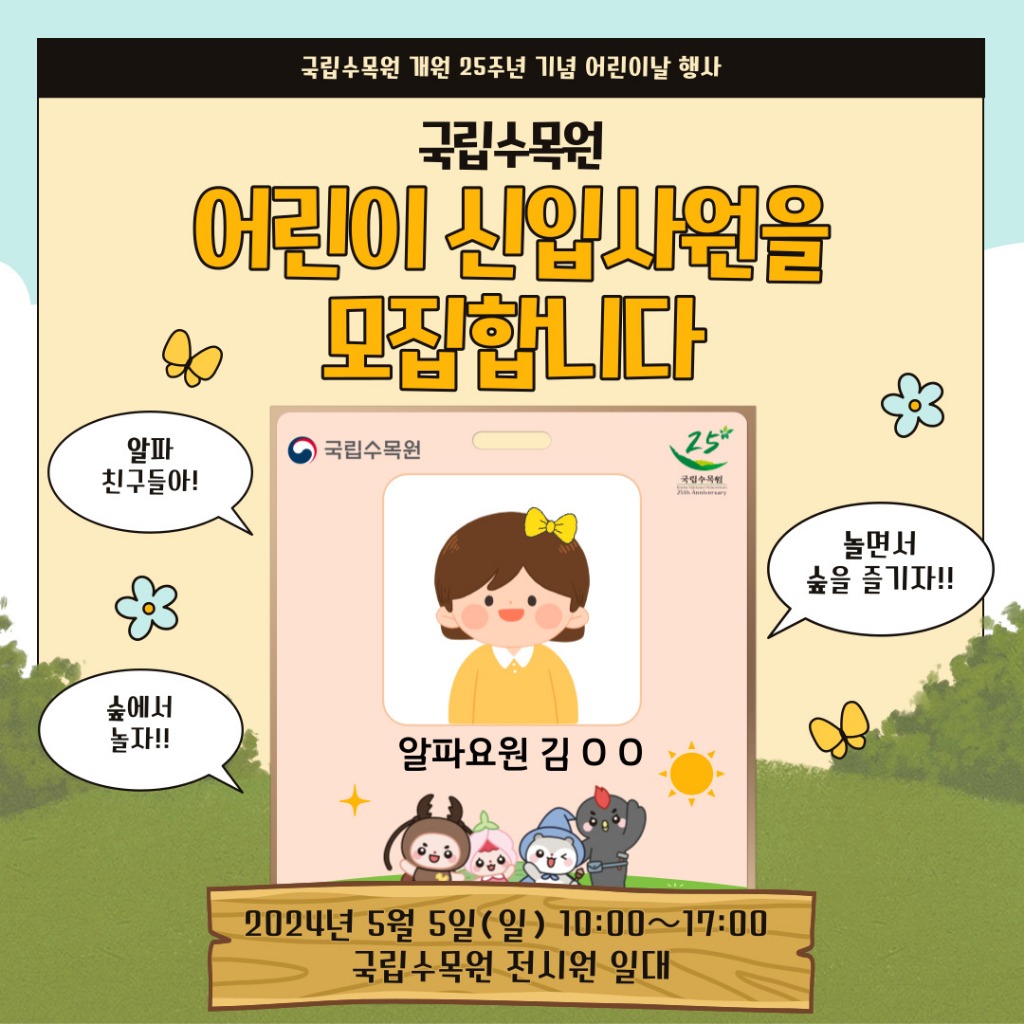 산림청 국립수목원은 개원 25주년을 기념하여 「국립수목원 어린이 신입사원 모집」이라는 주제로 오는 5월 5일(일) 오전 10시부터 오후 5시까지, 국립수목원 일대에서 특별한 어린이날 행사를 진행한다고 밝혔다.