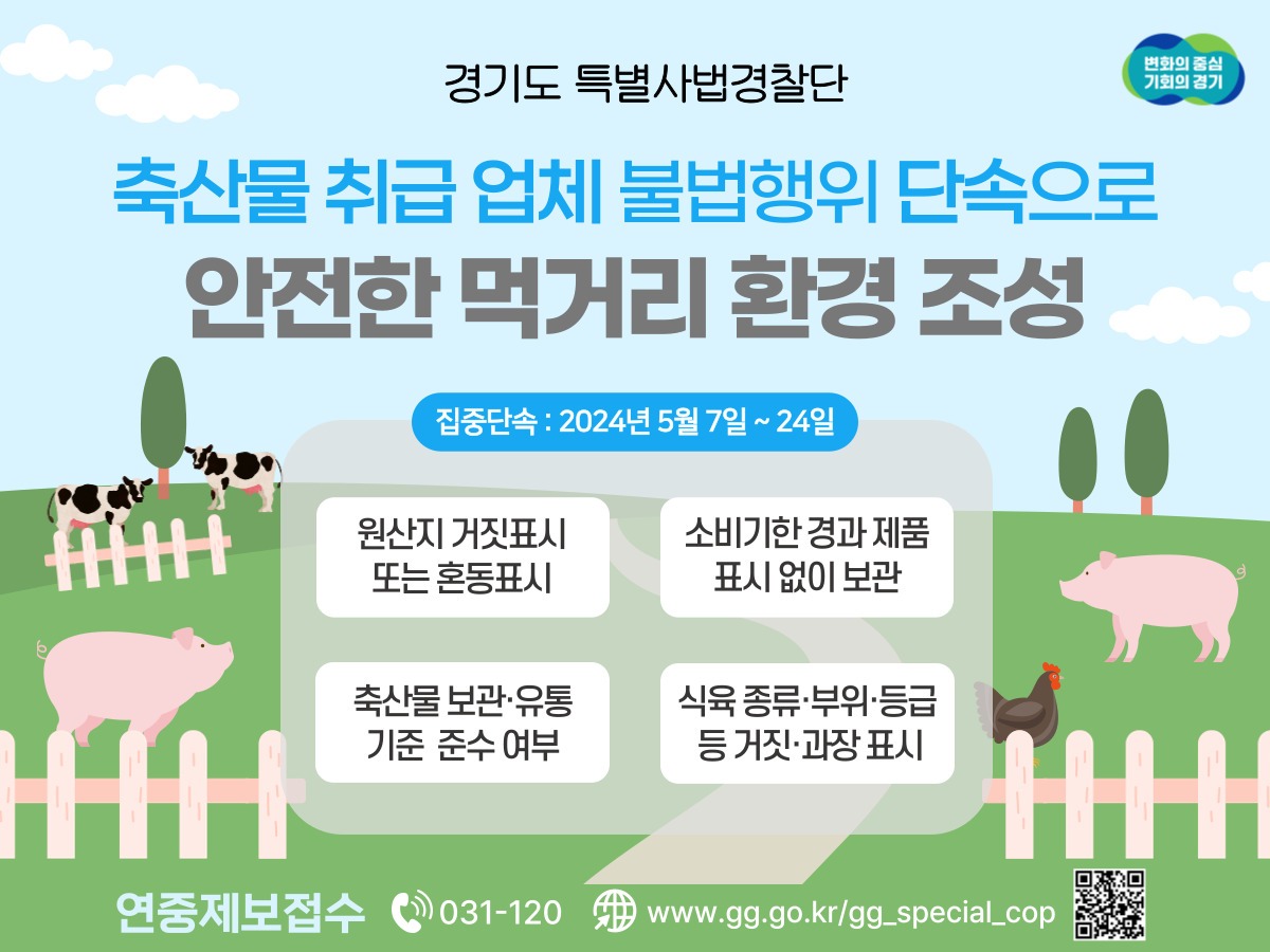 경기도 특별사법경찰단은 오는 5월 7일부터 24일까지 도내 축산물 가공·판매업소, 정육식당 등을 대상으로 축산물 가공·유통과정에서의 불법행위를 집중 단속한다고 30일 밝혔다.
