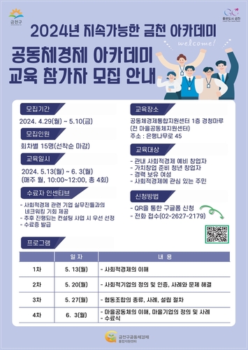 금천구는 지역사회 사회적경제를 활성화하기 위해 오는 5월 13일부터 4주 동안 공동체경제통합지원센터에서 '지속가능한 금천 아카데미'를 운영한다고 밝혔다.