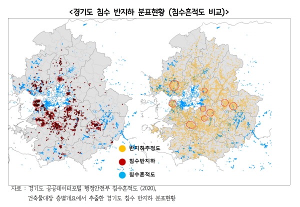 경기도 침수 우려 지하 주택(우선 조사대상)은 현장 조사 집계표(2022년 12월까지 재난지원금 및 풍수해보험금 지급 가구 기반 침수 재해가 있었던 가구)에 따르면, 반지하주택 중 침수 반지하주택 개수는 8,861건(6.5%)에 해당하는 것으로 나타났다. 이를 경기도 공공데이터포털 행정안전부 침수 흔적(2020년)과 경기도 침수 반지하 분포 현황(건축물대장 층별개요 추출)을 비교해 보면 반지하 밀집 지역 분포와 침수 재해 반지하의 분포도가 일치하지 않는 것으로 나타났다. 이에 반지하주택의 전체적 대응보다는 우선적으로 인명사고가 발생하는 침수반지하 전수에 대한 대안 마련이 시급하다는 점을 꼽았다.