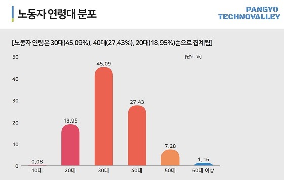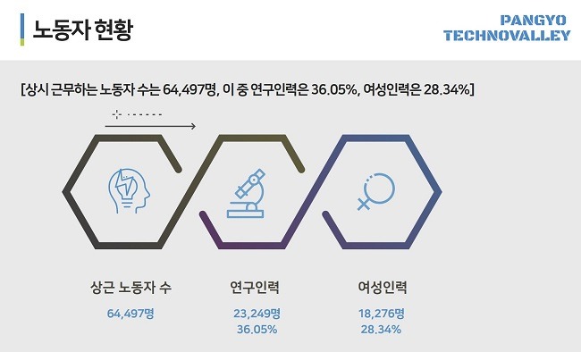 입주기업 1,259개 중 941개 업체(74.74%)가 본사를 판교테크노밸리에 두고 있으며, 연구소를 운영하는 기업은 674개로 집계됐다. 상시 근무하는 노동자 수는 6만4,497명으로 2018년 6만3,050명 대비 1,447명 증가했고, 주요 연령대는 20~30대 64.04%로 젊은 층이 주를 이루고 있다.