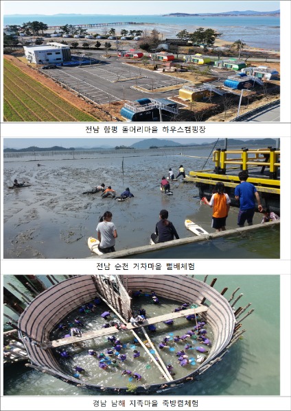 전남 함평군 돌머리마을은 인근에 돌머리해수욕장과 함께 하우스캠핑장 등 숙박시설을 갖춰 가족 단위 관광객들이 바다와 함께 휴식을 즐기기 좋을 것으로 기대된다. 전남 순천 거차마을(뻘배체험-뻘배어업(국가중요어업유산 제2호) : 썰물 때 뻘배를 타고 갯벌에서 수산물을 채취하는 어업)과 경남 남해군 지족마을(죽방렴체험-좁은 바다의 물목에 대나무로 만든 그물을 설치하여 물고기를 잡는 어업)에서는 우리나라의 전통어업을 경험할 수 있다. 일부 어촌체험휴양마을에서는 참가자들을 위해 쉼터와 음료 등을 무상으로 제공할 계획이다.