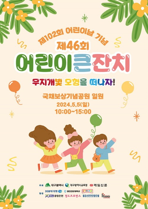 제102회 어린이날을 맞이해 미래의 주인공인 어린이와 온 가족이 함께 즐길 수 있는 다채로운 체험행사가 마련된 ‘제46회 어린이 큰잔치’가 5월 5일(일) 국채보상운동기념공원에서 열린다.