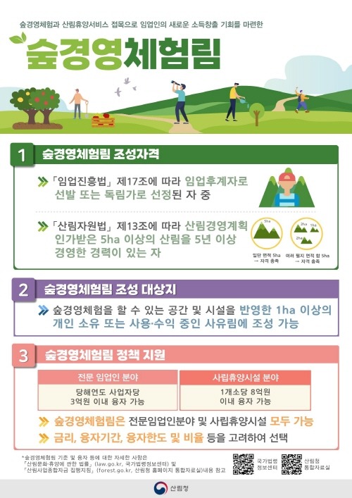숲경영체험림을 조성하기 위해서는 임업후계자 및 독림가로서 산림경영계획에 따라 5ha 이상 산림을 5년 이상 경영한 경력이 있어야 하고, 필수시설인 숲경영 체험시설과 함께 숲속의 집, 산책로, 야외쉼터 등을 설치할 수 있다.