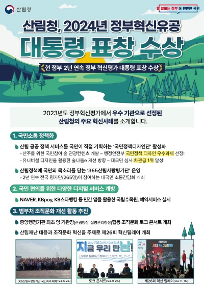 이는 지난해 45개 중앙행정기관 중 차관급 기관 1위를 달성한 것으로 산림청은 2년 연속 정부혁신평가에서 대통령 표창을 수상하는 성과를 거뒀다.