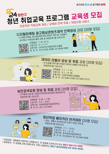양천구는 지역청년들의 취업역량 강화를 위해 인터넷 미디어, 첨단과학, 안전환경 등 4개 분야에서 전문 교육기관과 연계한 취업 교육 프로그램을 운영하고 이달부터 대상자 85명을 모집한다고 8일 밝혔다.