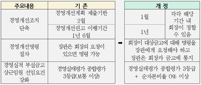 특히 경영개선계획과 경영개선권고 이행기간을 각각 회장이 정할 수 있도록 하는 등 타 상호금융업권 수준으로 개선한다.
